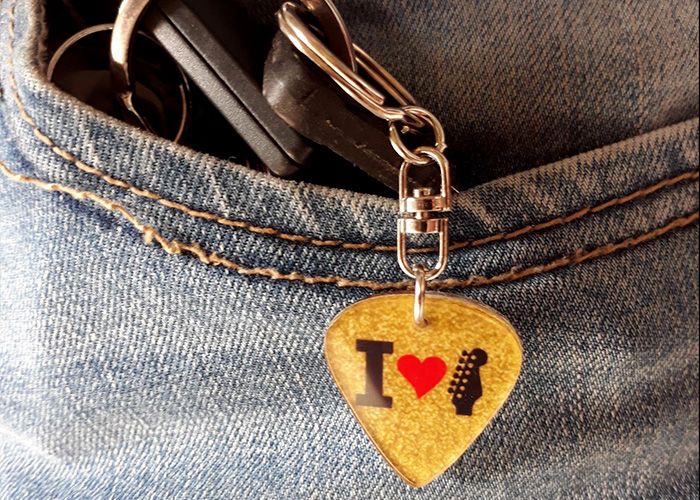 Leggi tutto …Portachiavi forma plettro chitarra a tema musicale